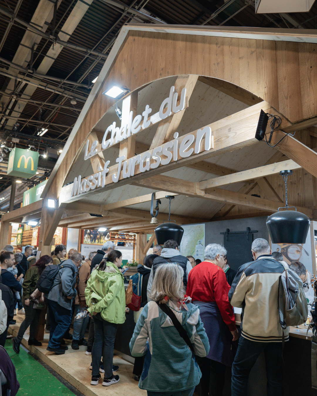 Stand Le Chalet du Massif Jurassien, commun aux 4 AOP franc-comtoises : Morbier, Comté, Bleu de Gex Haut-Jura, Mont d’Or